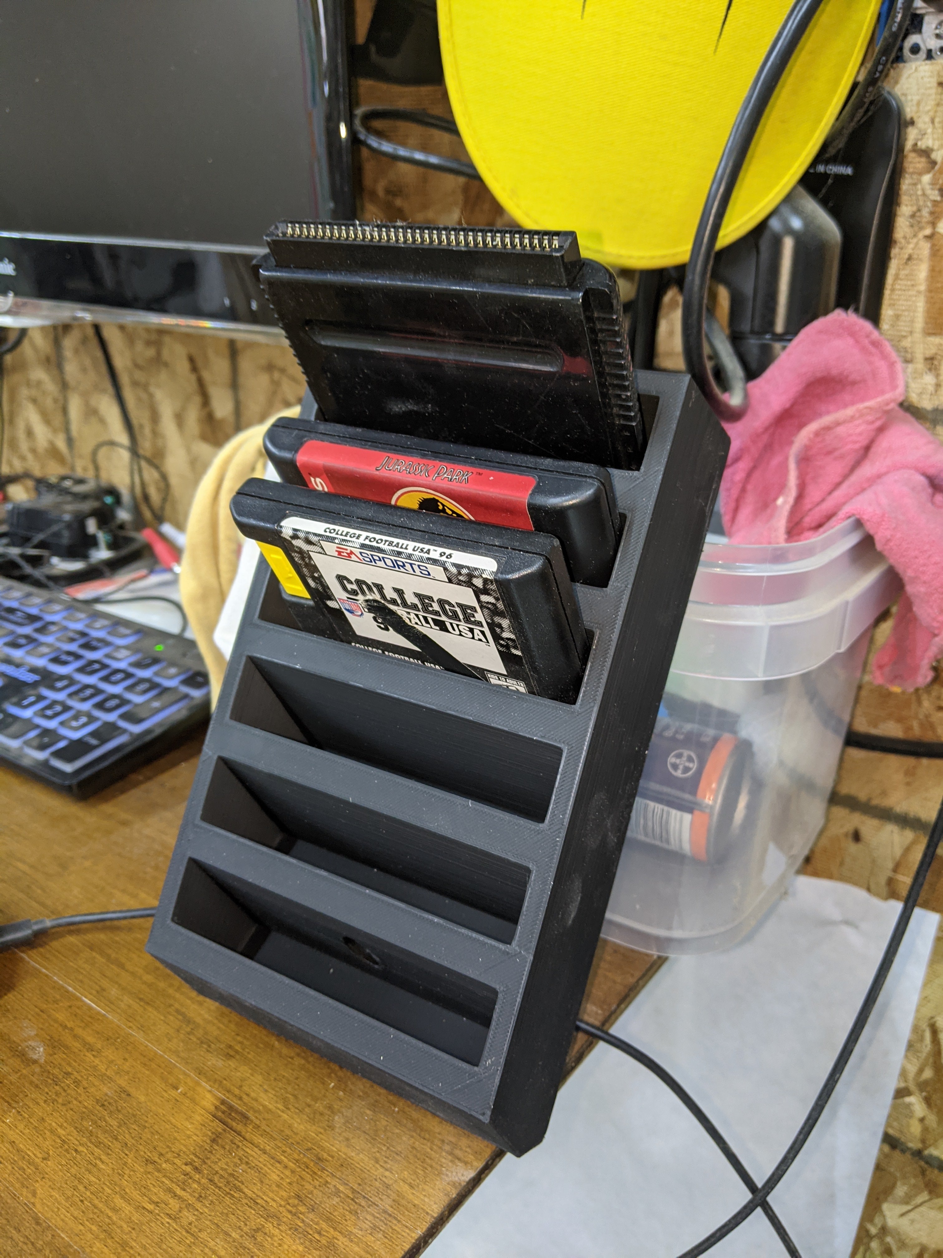 I still have a Sega Genesis and wanted the games to all be visible, so I made these holders that mount to the wall.