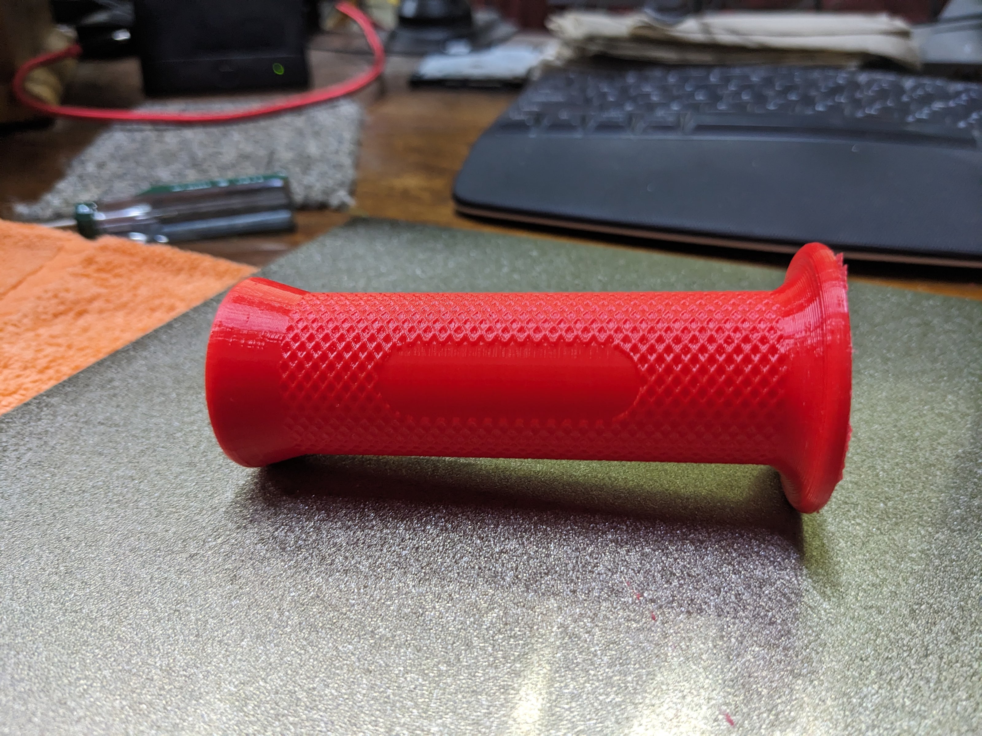 A friend has a 1960s-era Harley Davidson scooter and needed some replacement grips. Using one of the worn-out ones, I was able to recreate it using a flexible TPU filament.
