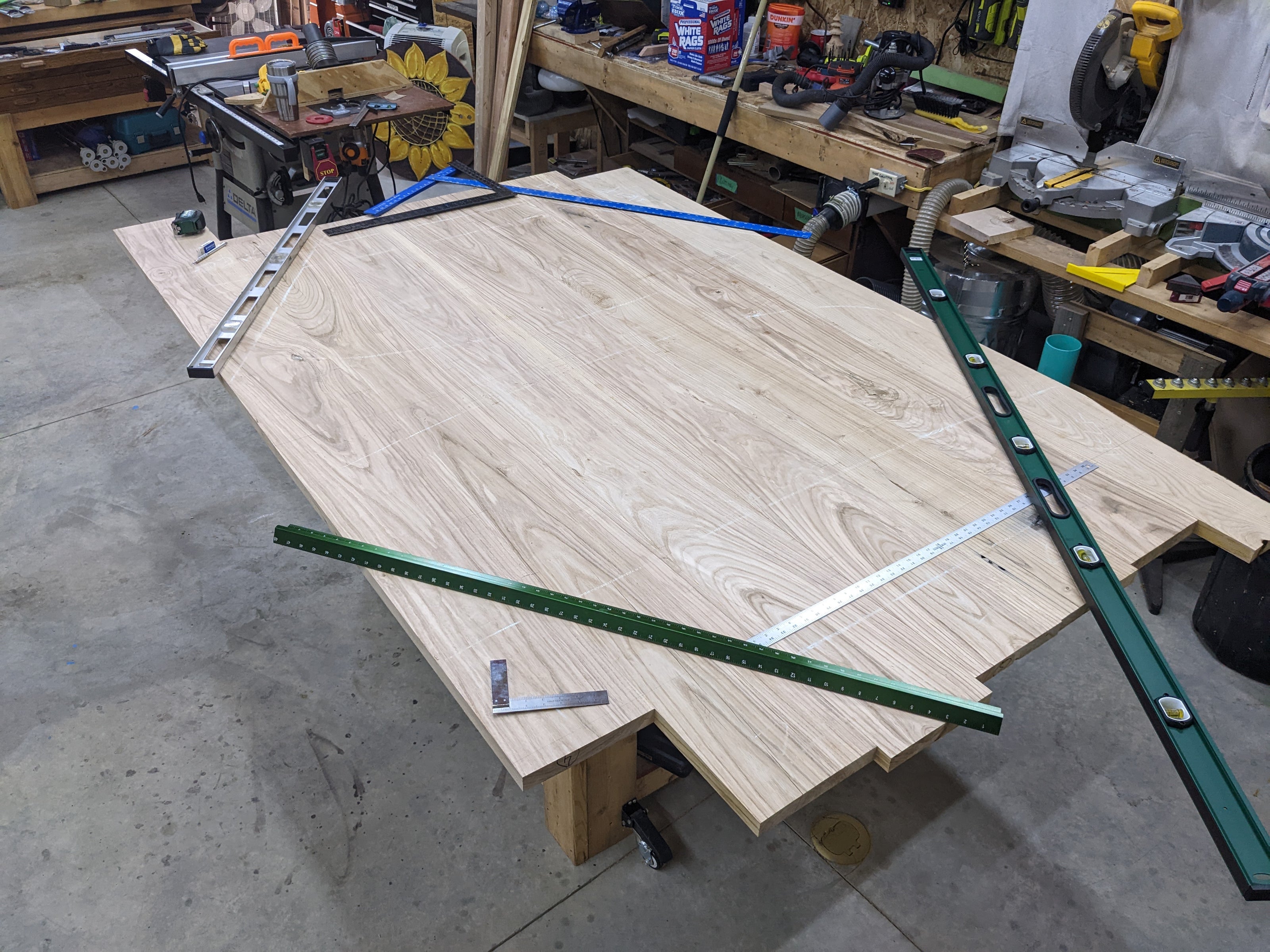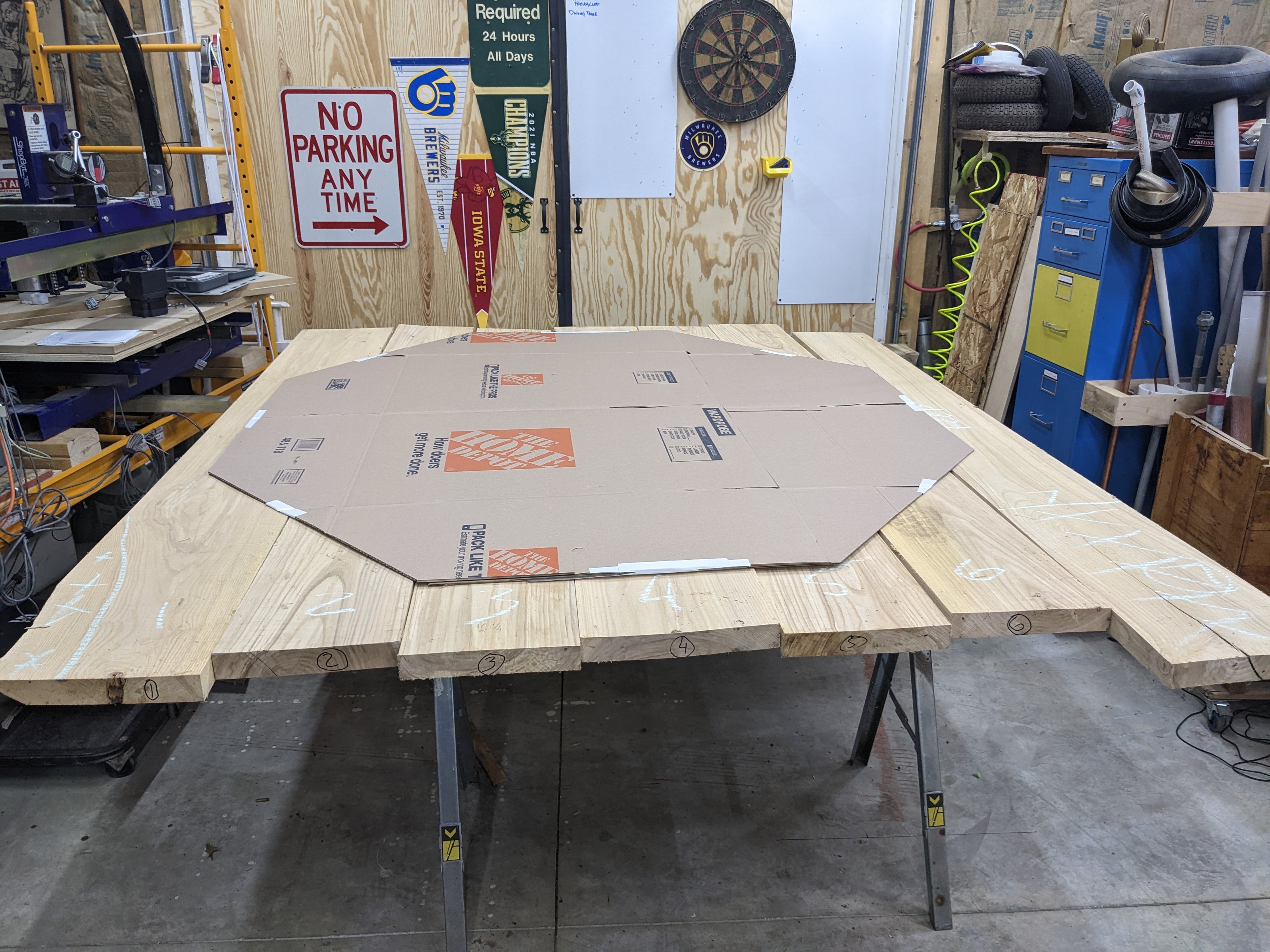 This template served two purposes. It allowed me to take the CAD design and translate it to the actual wood, but also allowed me to take it inside and get a feel for how that size works in the actual room.
