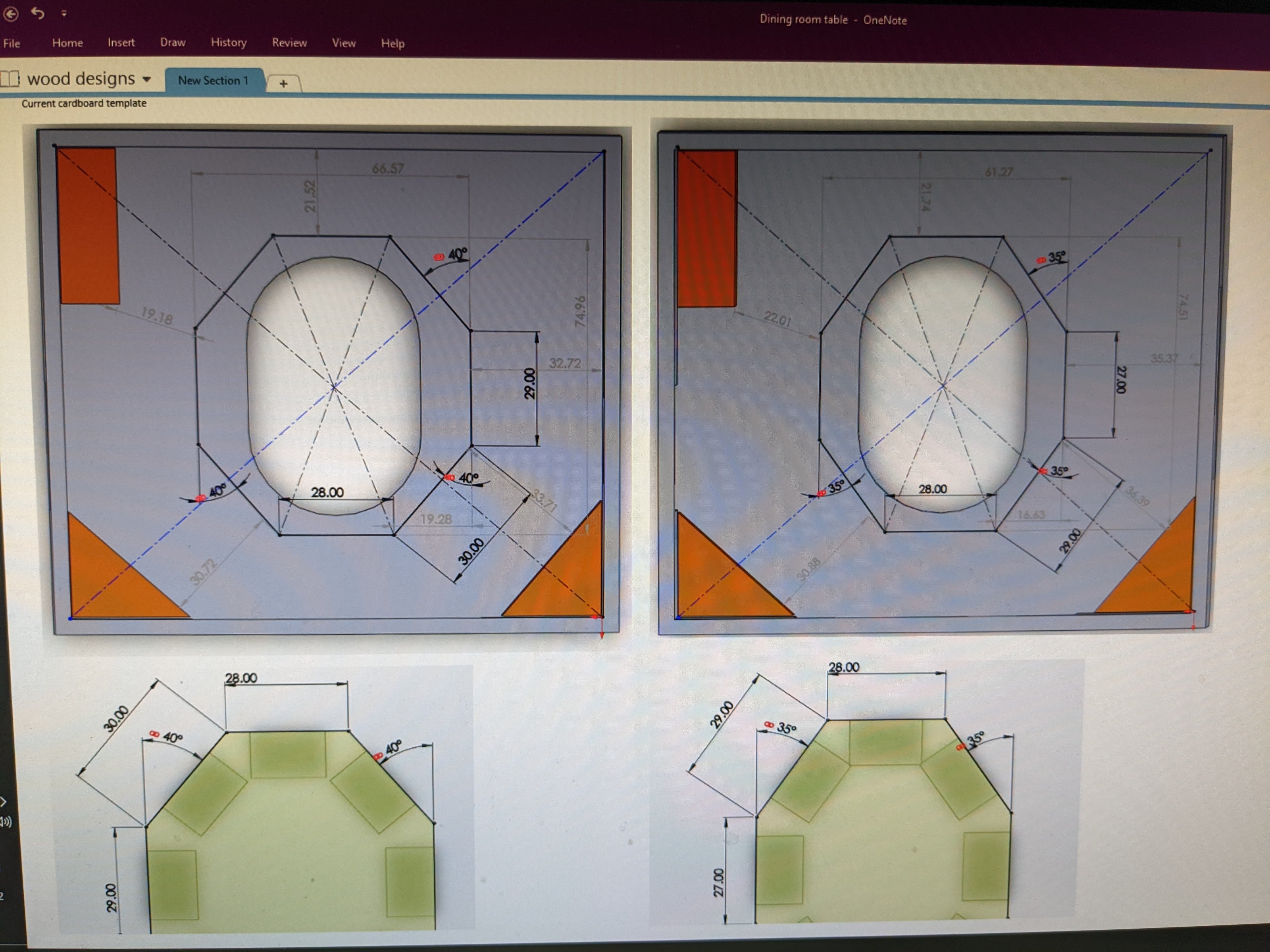 I went thru a few iterations here. The orange things are furniture or shelves I had to work around in the room. The oval in the middle is the size of our old table. The dark green parts at the bottom are the size of a standard place setting. Lots of constraints on this design!