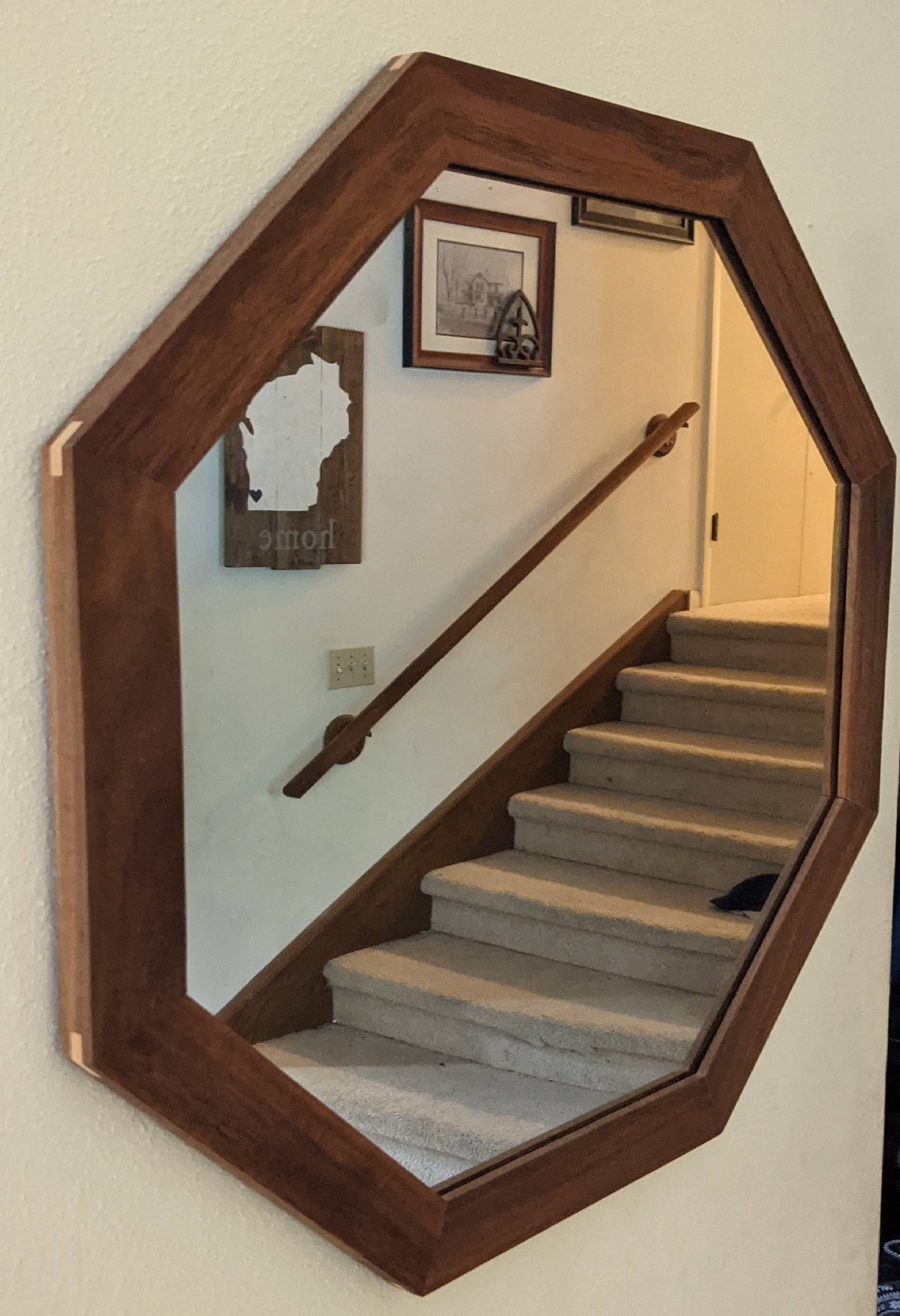 The previous owners of our house left this cool octagonal mirror behind, so I threw a walnut and maple frame around it.