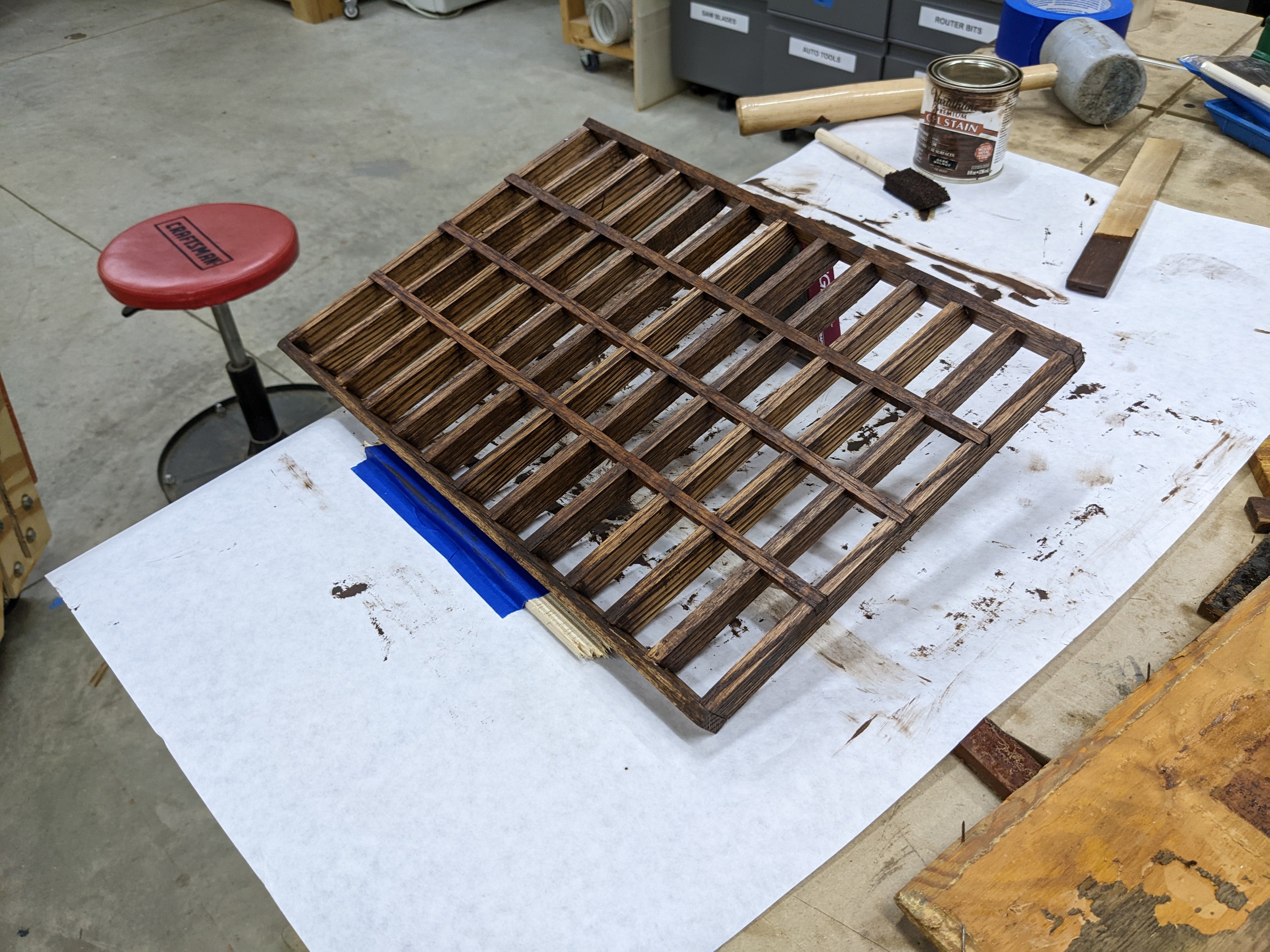 A serving tray I made for Angie's mom from scrap plywood laid on its edge. Yes, the pattern is slightly crooked - it's a bit of a joke to play on her OCD!