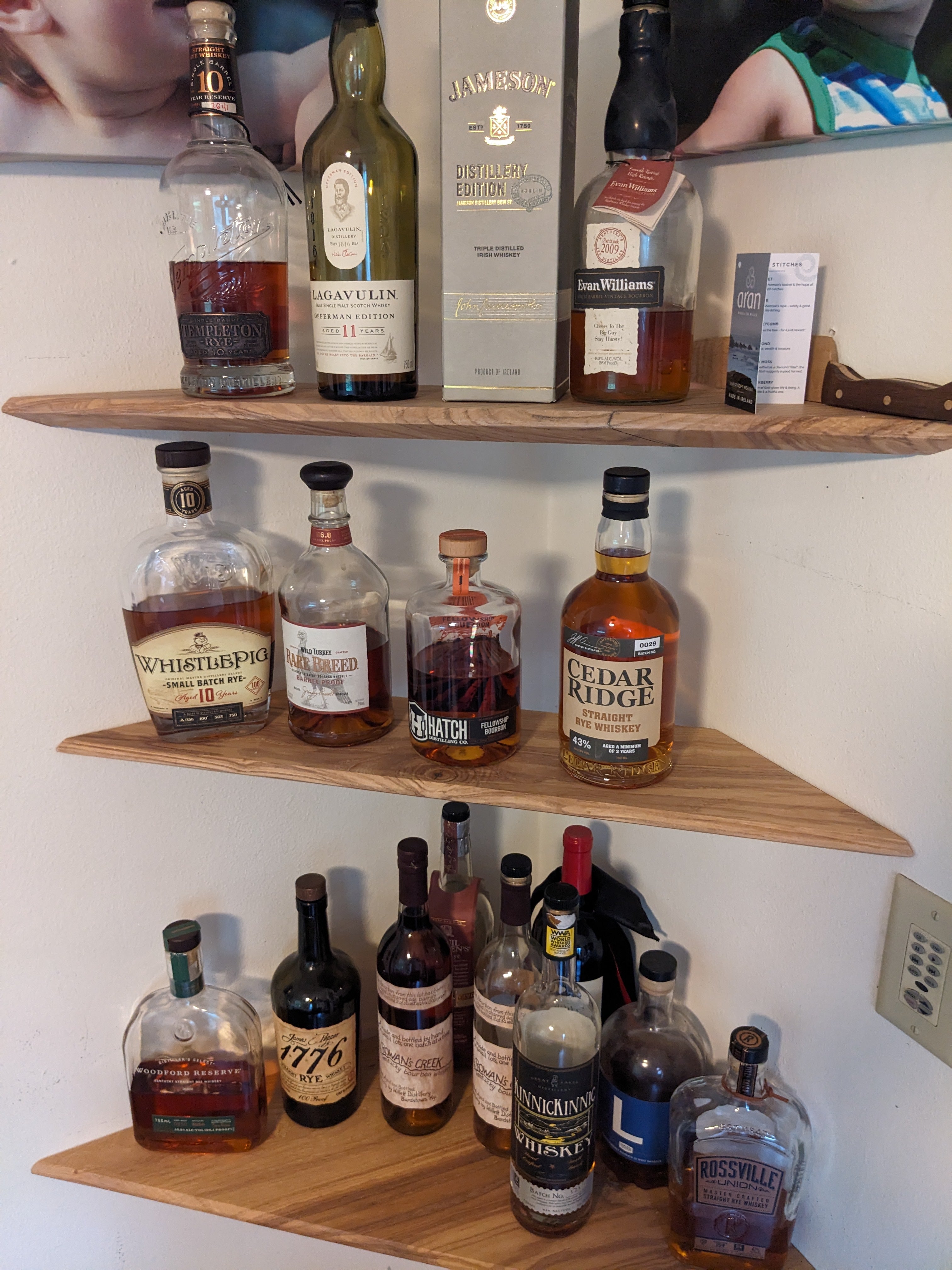 Somewhere along the line, I guess I started collecting various bourbons and ryes. I made these shelves from the corner cutoffs of the dining room table.