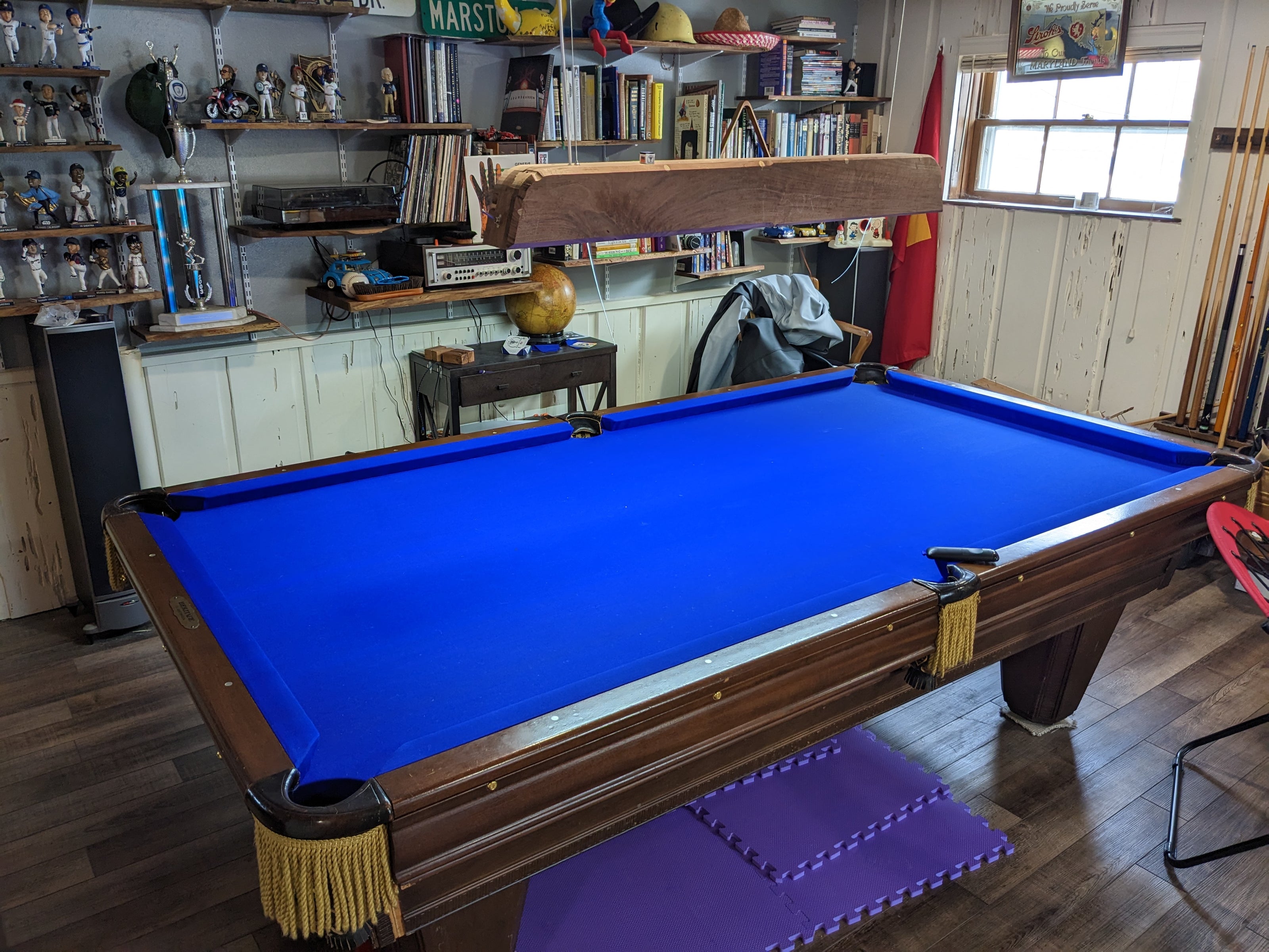 Hangs from the ceiling with stainless cable and really makes the felt pop.