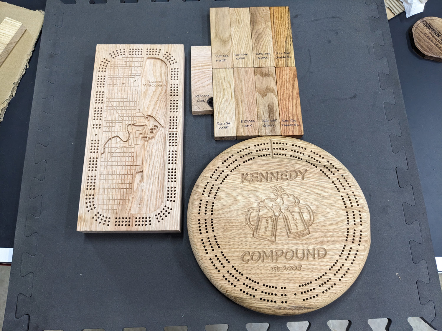 The samples above with a new and unfinished (raw) Racine map and the first board I made in 2022 (also raw). You can see how the red tint disappears over time.