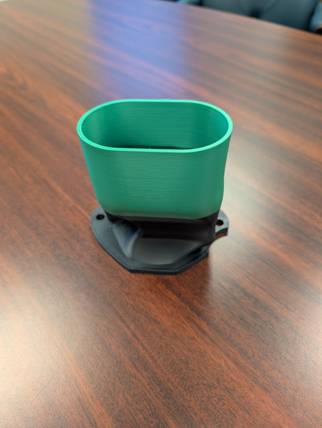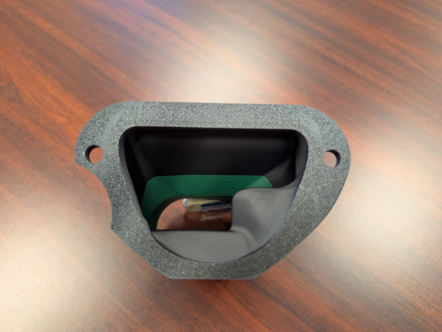Pat and I got back at it this winter after he upgraded the intake plumbing on his John Deere 4066r tractor for increased airflow. This updated cold-air intake adapter matches up with the firewall opening and bolt holes for significantly easier mounting than the original version. Like the last version, it has a strange shape to work around the radiator cap. A 3.5" hose will fit over the mouth of it (2nd photo).